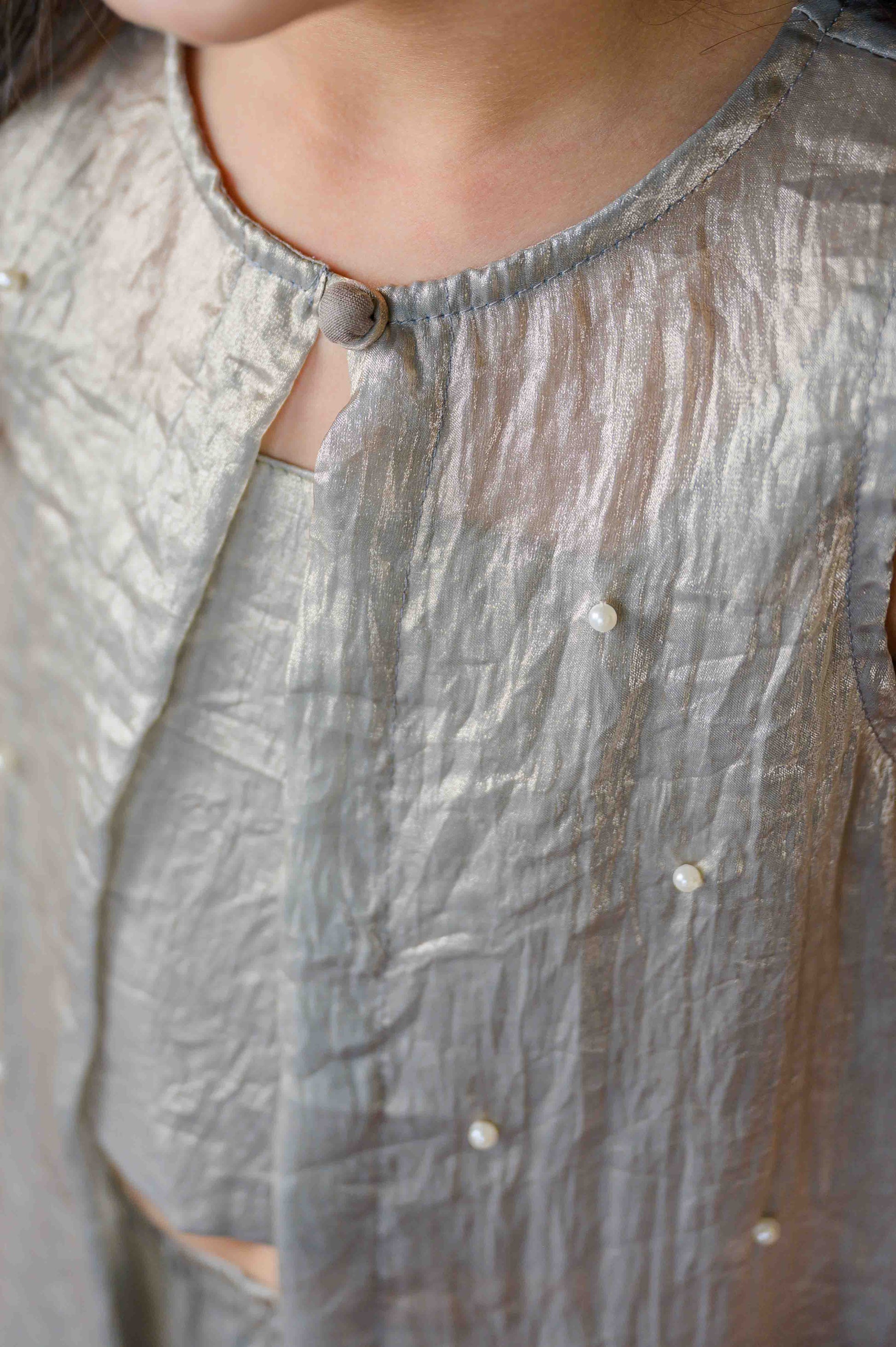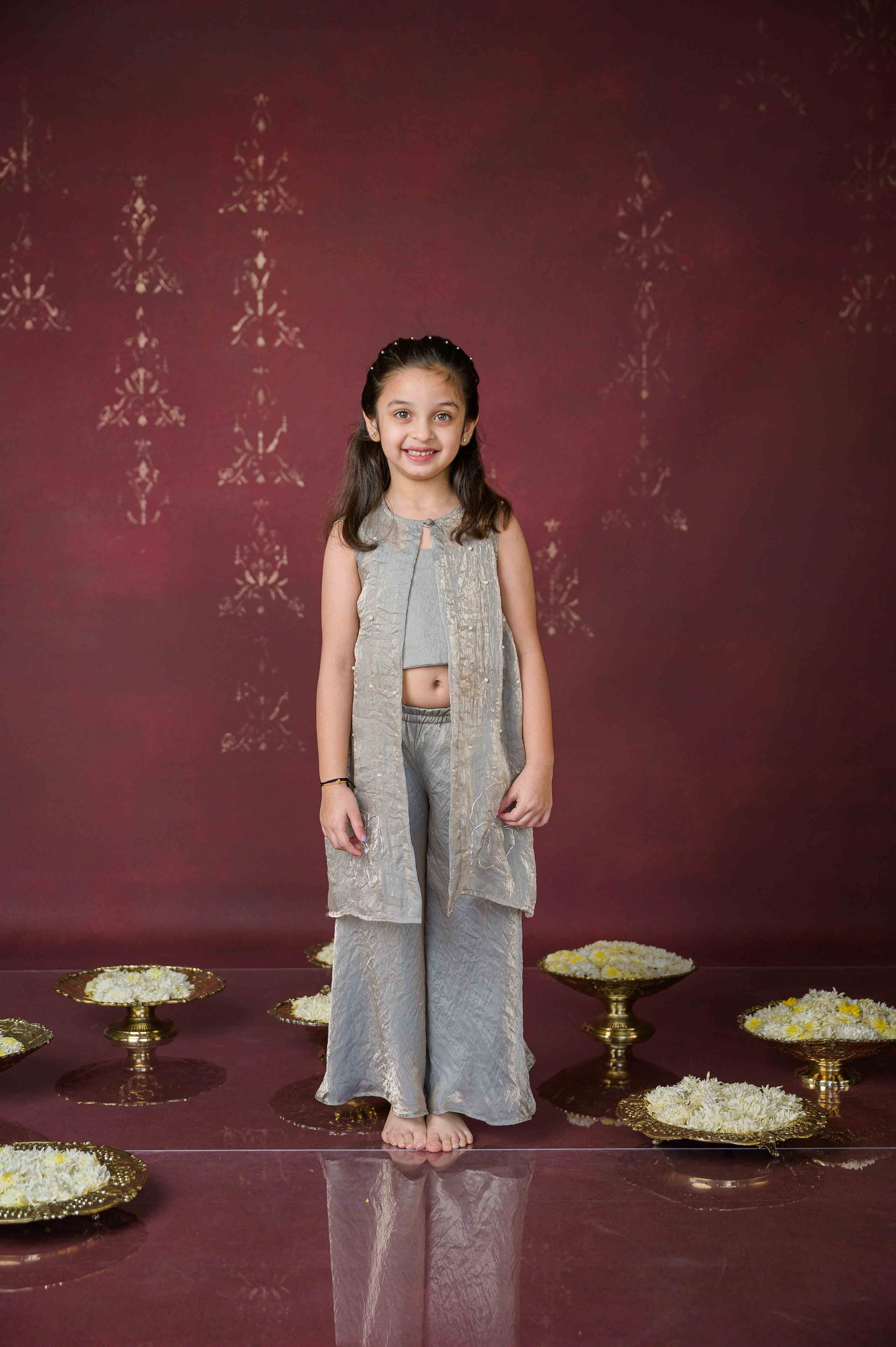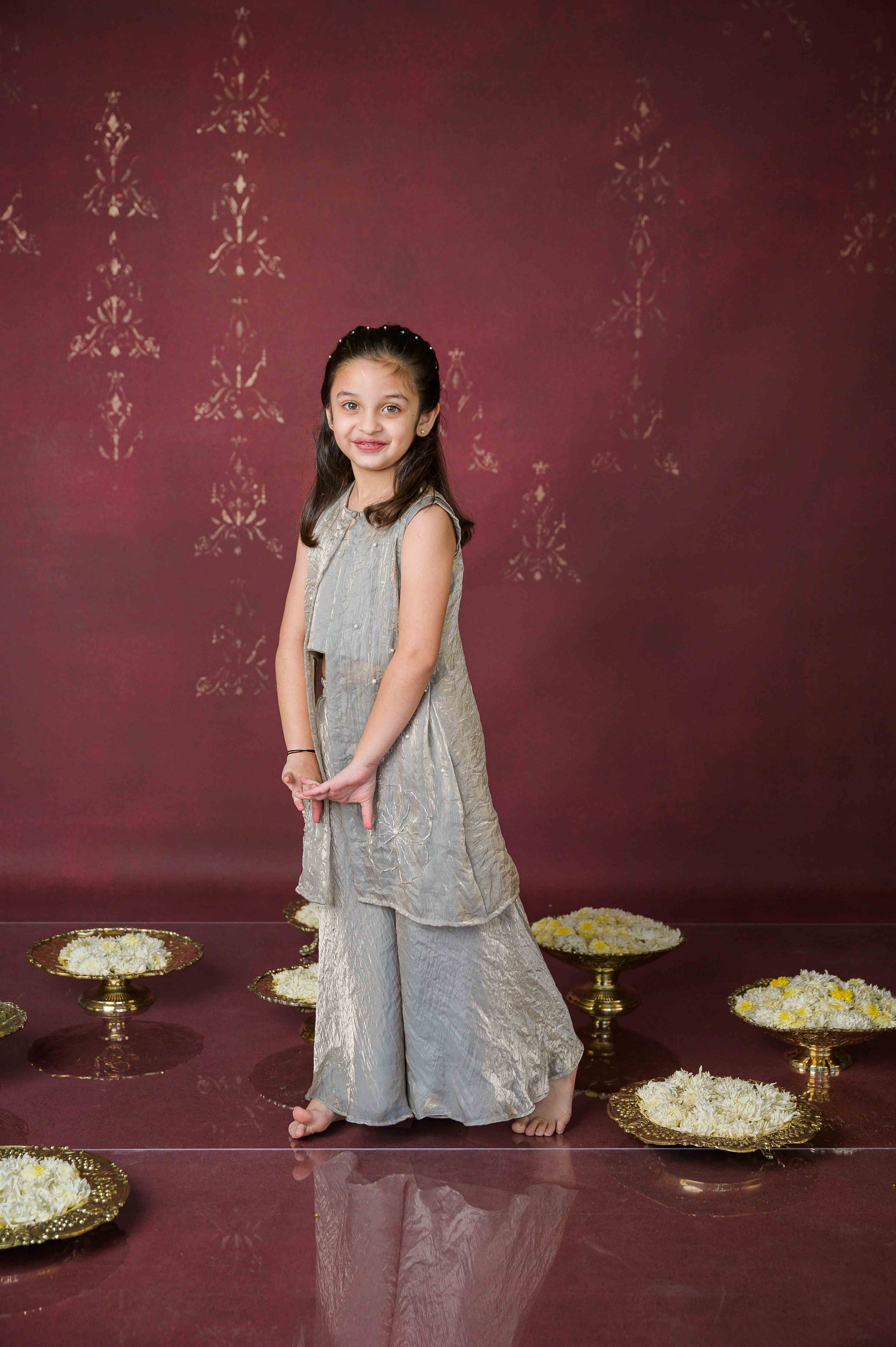 Bring home a shimmer of stardust with our Chandni Sheher Cape Set—a dreamy three-piece ensemble crafted for little ones who love to twirl in elegance. Designed in a soft grey tissue fabric, this set captures the quiet glow of moonlit nights and festive sparkle.