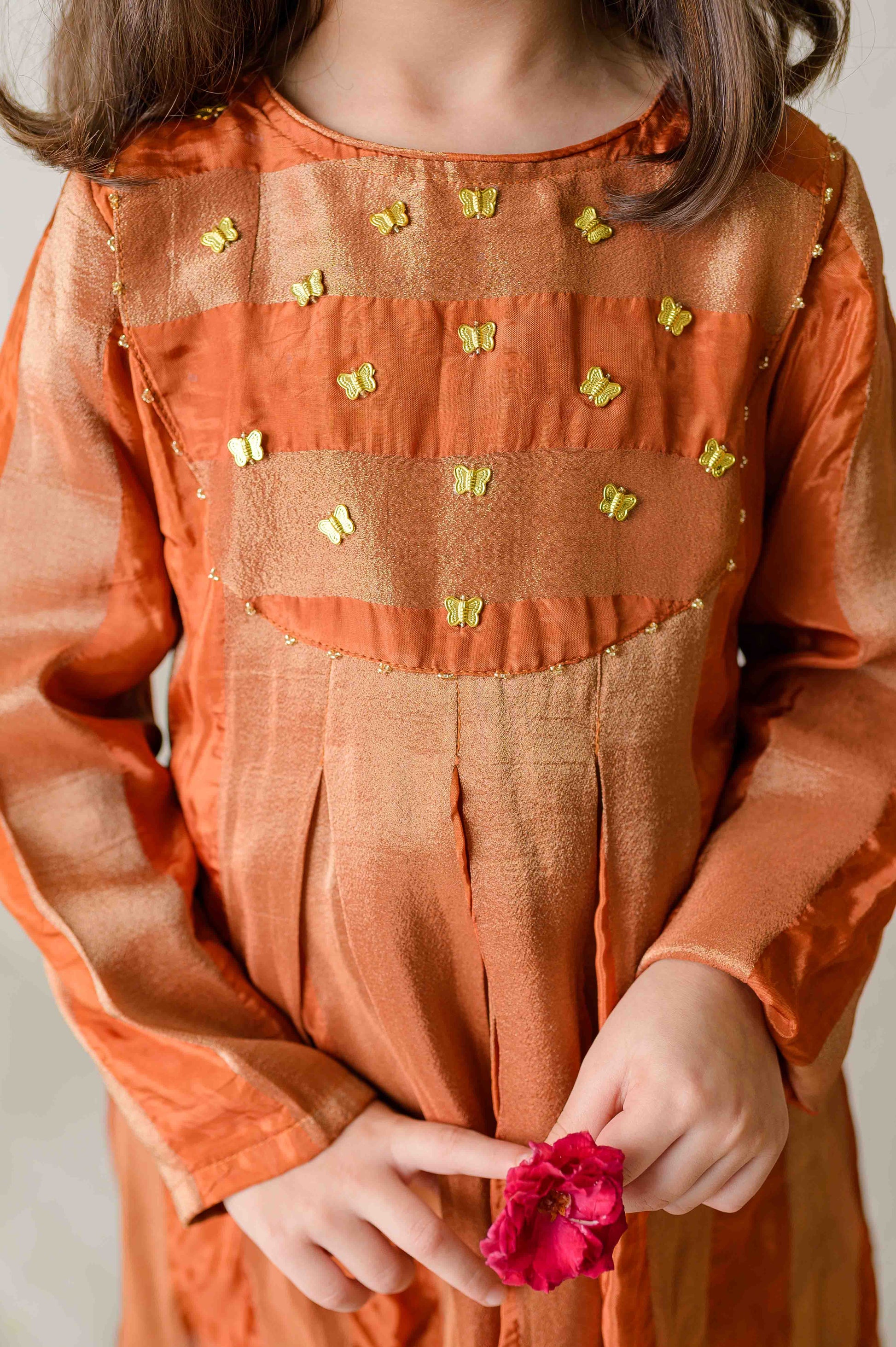 Just like its namesake, the Jalebi Kurta Set is a joyful swirl of tradition, color, and sweetness. Crafted in rich tissue silk, this set features a playful striped silhouette adorned with delicate hand-embroidered butterflies—a charming detail that brings the outfit to life.
