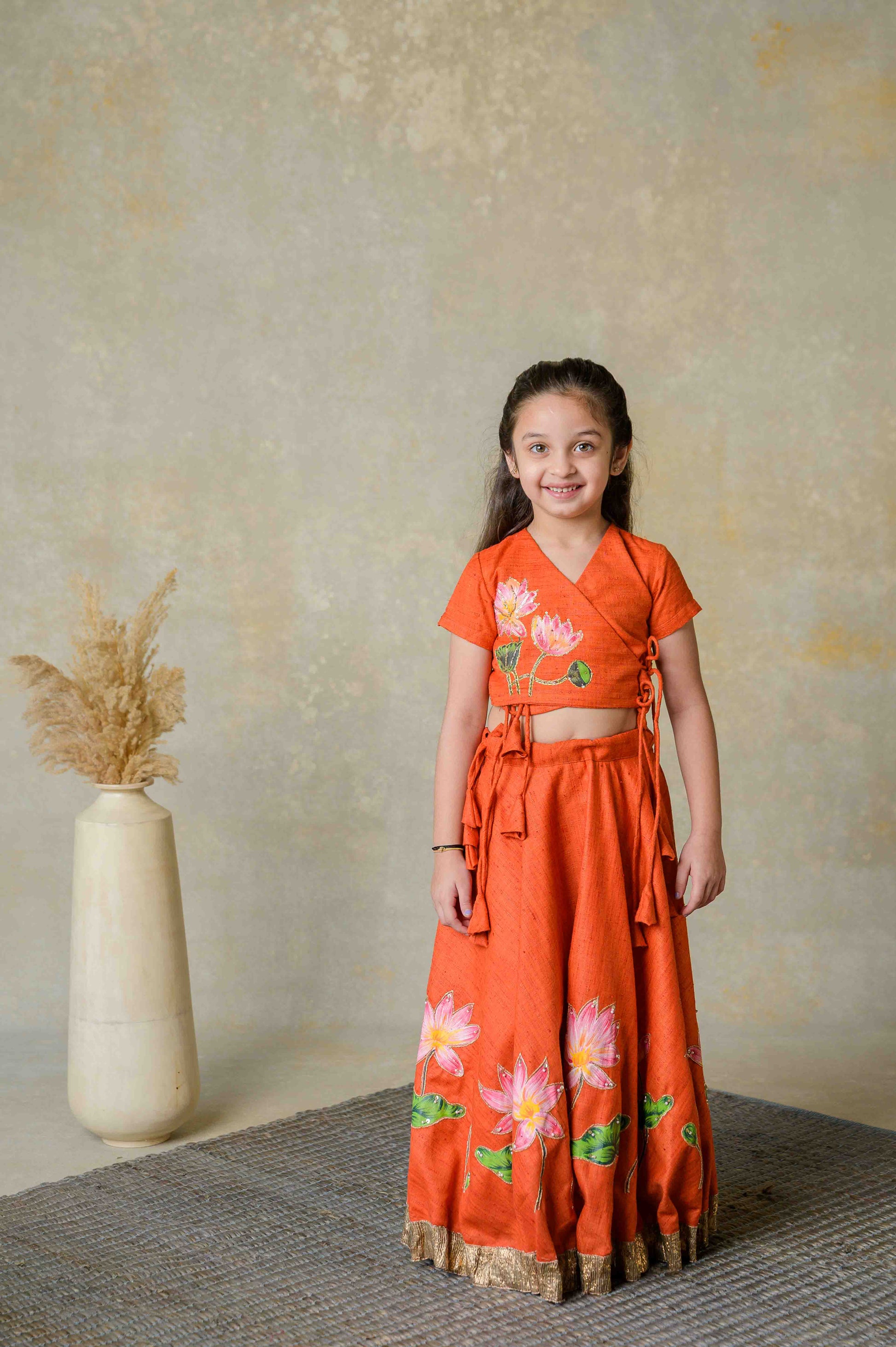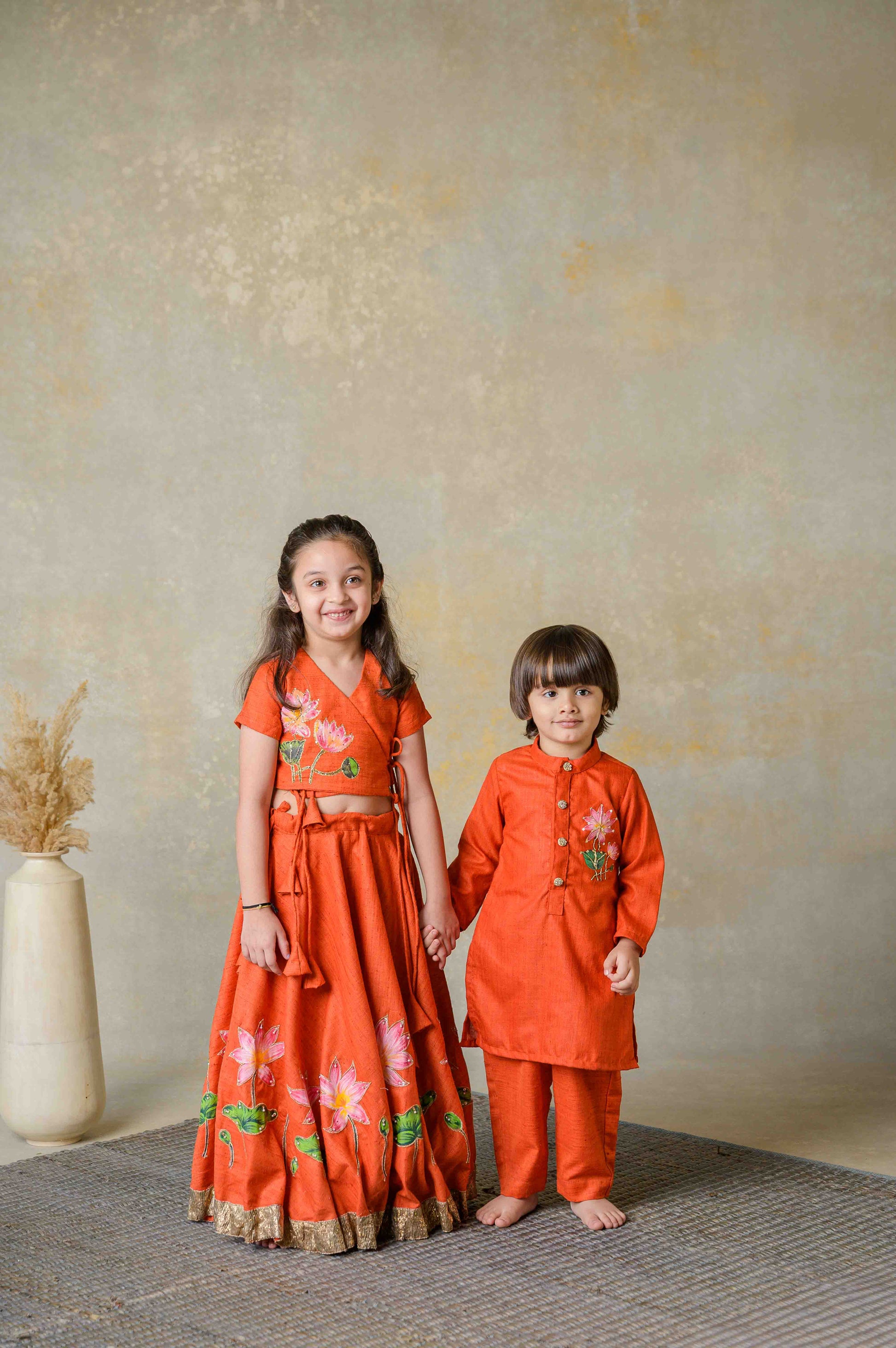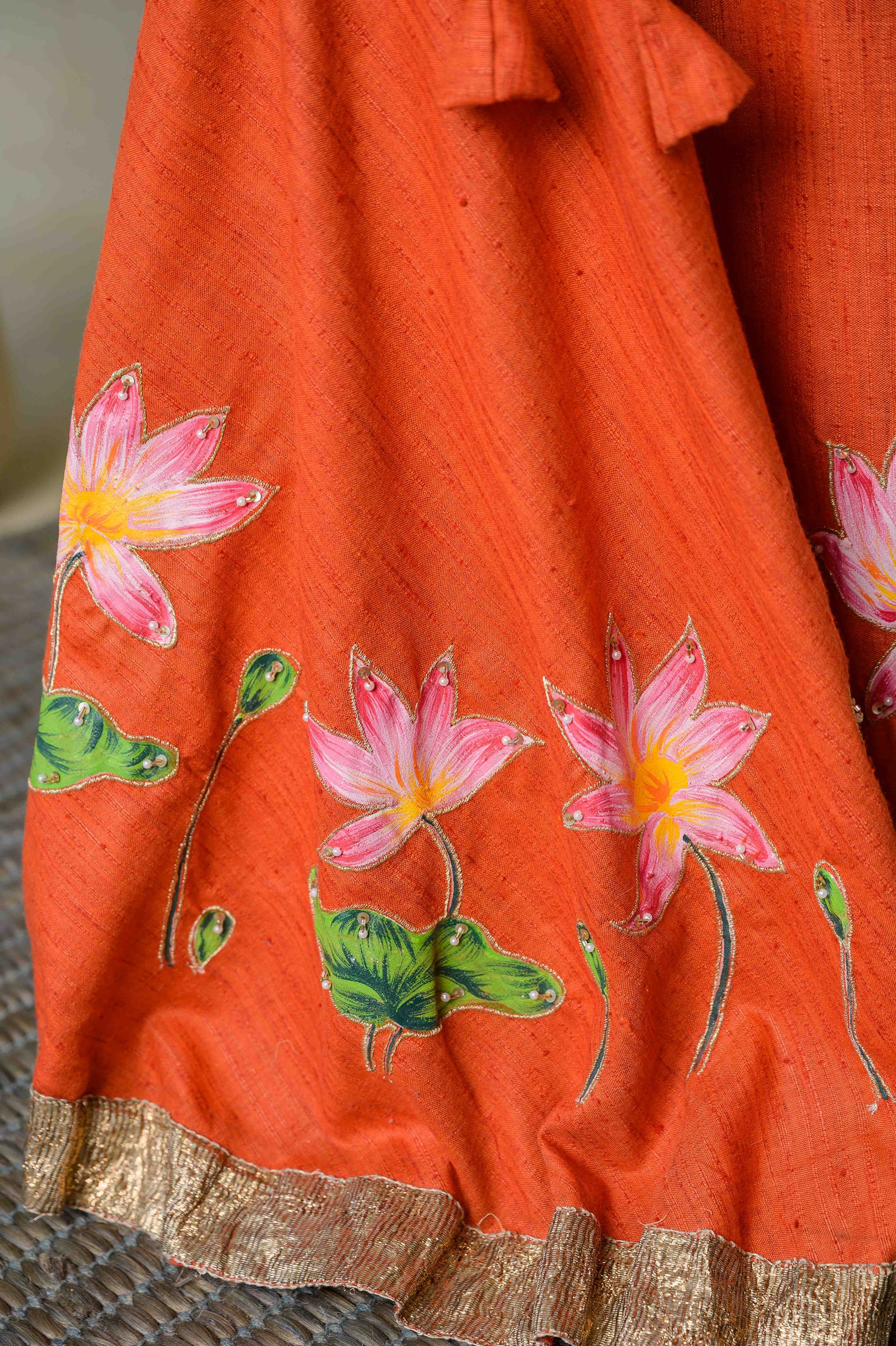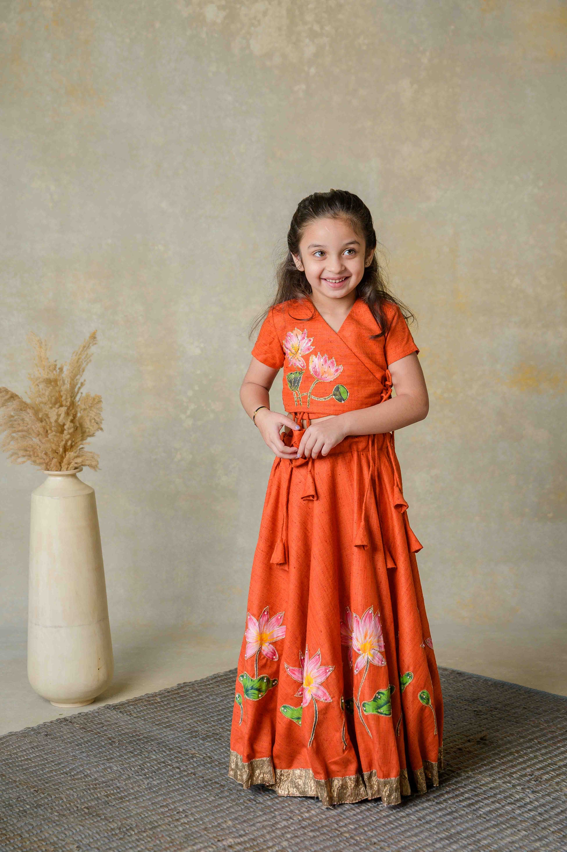 A vibrant celebration of art, tradition, and playful elegance — our Kamal Rang Tarang Set brings the serene beauty of lotus blooms to life for your little one. Hand-painted with love on luxurious matka silk, this outfit is designed to feel as joyful as it looks.
