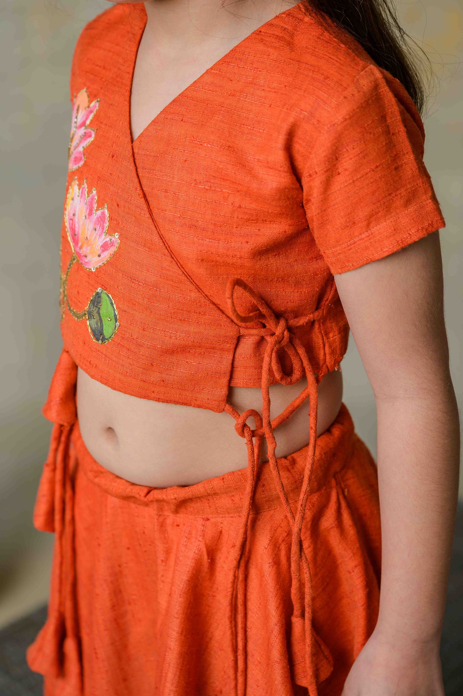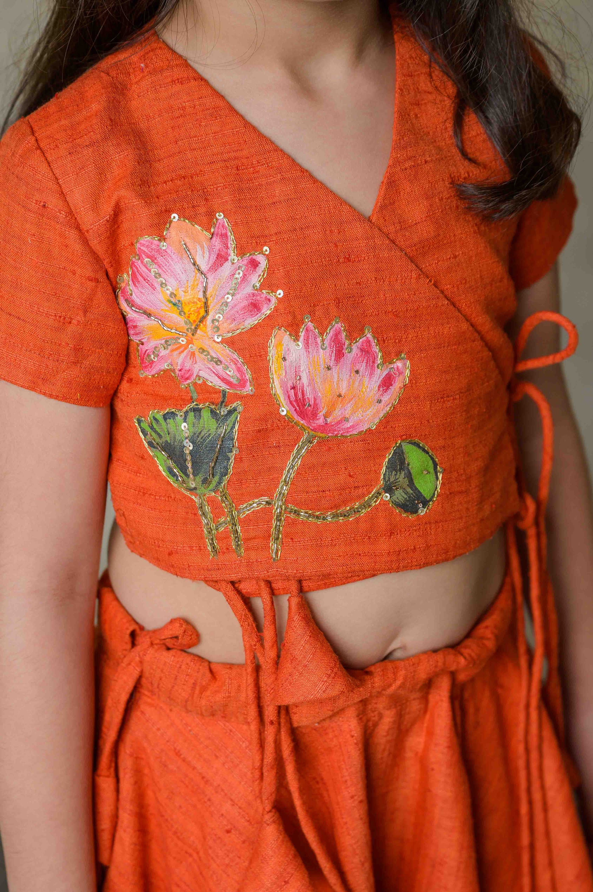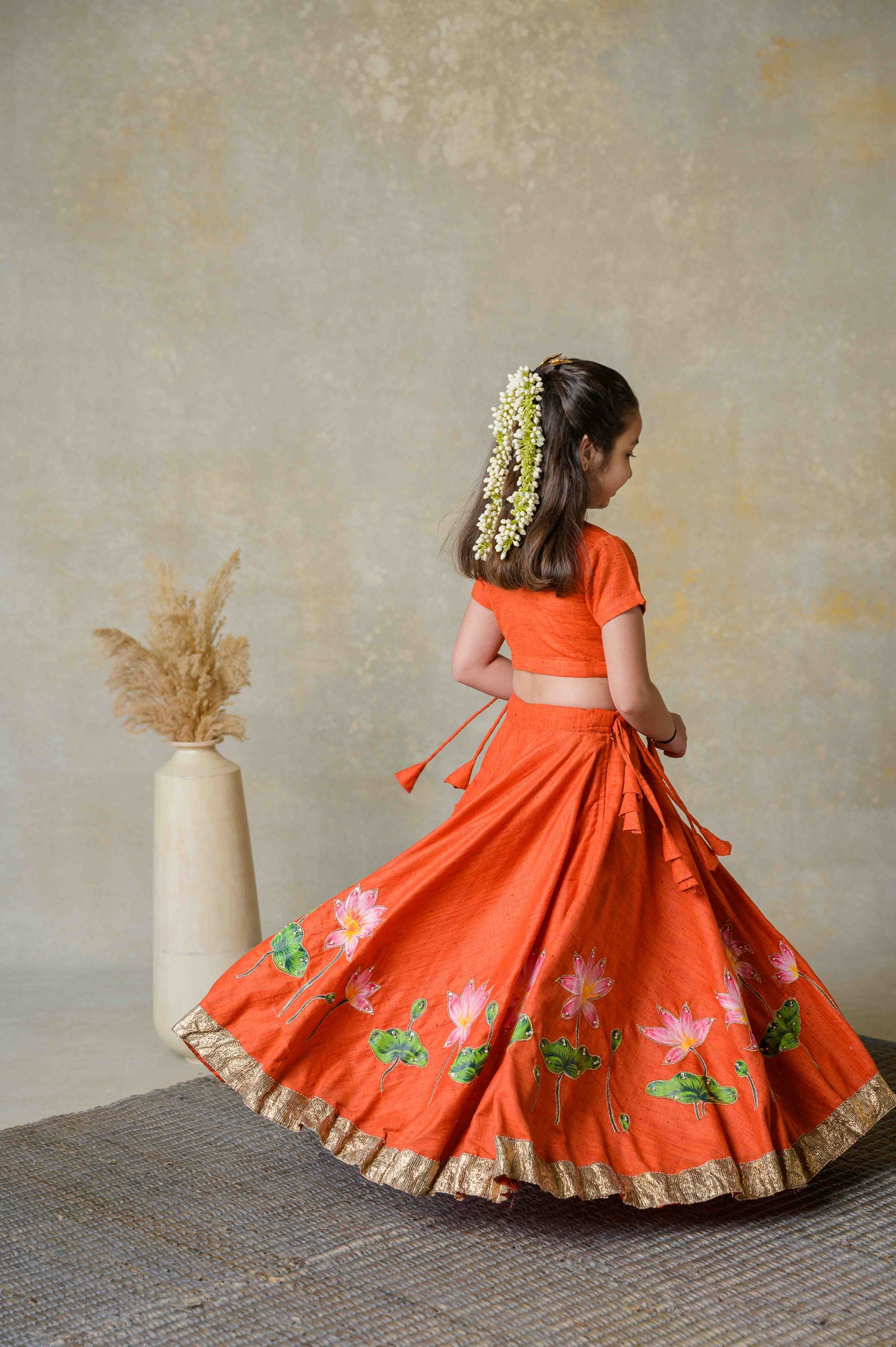 Crafted with a wrap-style blouse that ties gently at the sides and a beautifully flared lehenga, the ensemble allows easy movement while adding a festive charm. The lotus artwork flows gracefully along the hem, making every twirl feel like a moment from a storybook. Made in rich matka silk, the texture stays breathable yet festive, perfect for long celebrations.