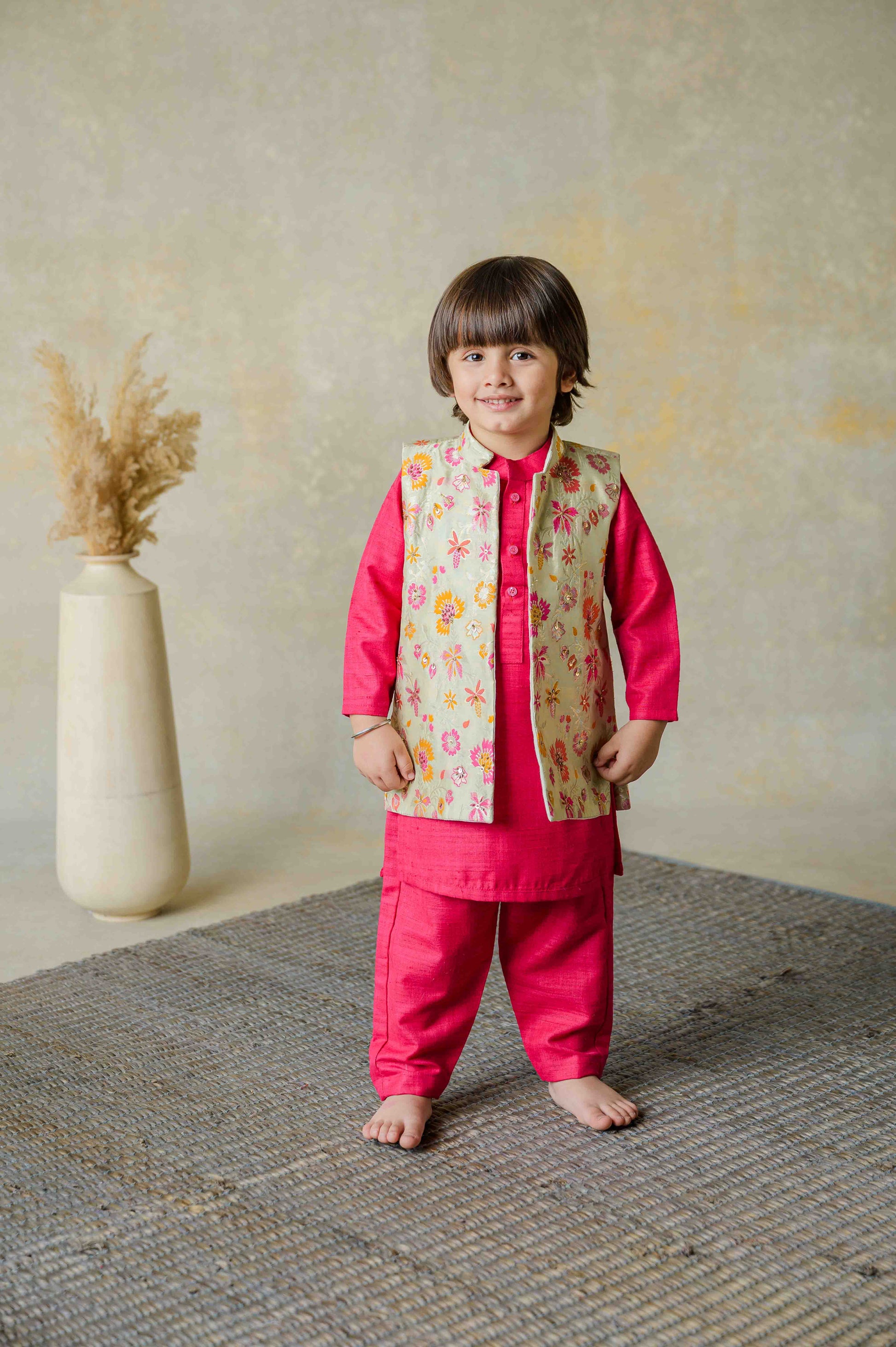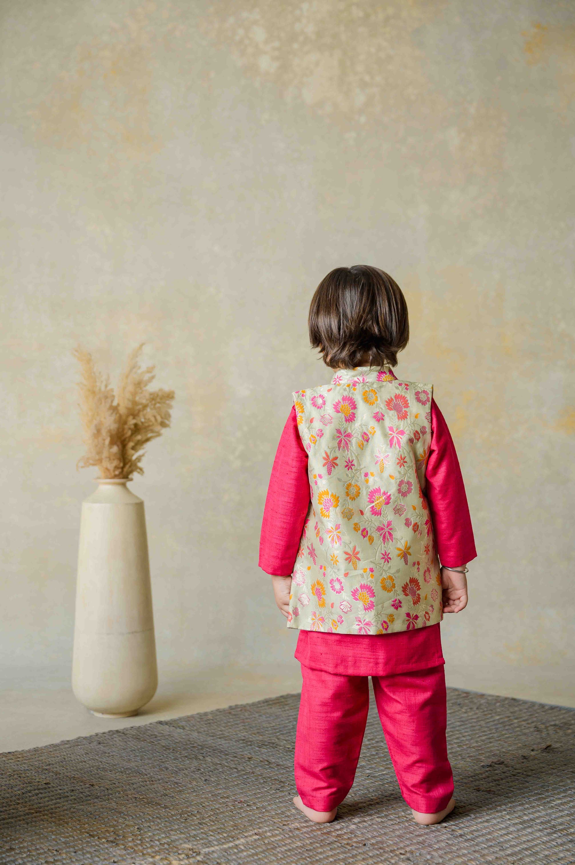 Crafted in soft, breathable fabric, the kurta and pants ensure easy all-day wear, while the lightly embroidered floral jacket adds a delightful touch of festivity. The sleeveless jacket layers beautifully, making the outfit stand out without ever weighing your child down. Thoughtfully stitched for comfort, this set lets kids run, twirl, and enjoy every moment with ease.
