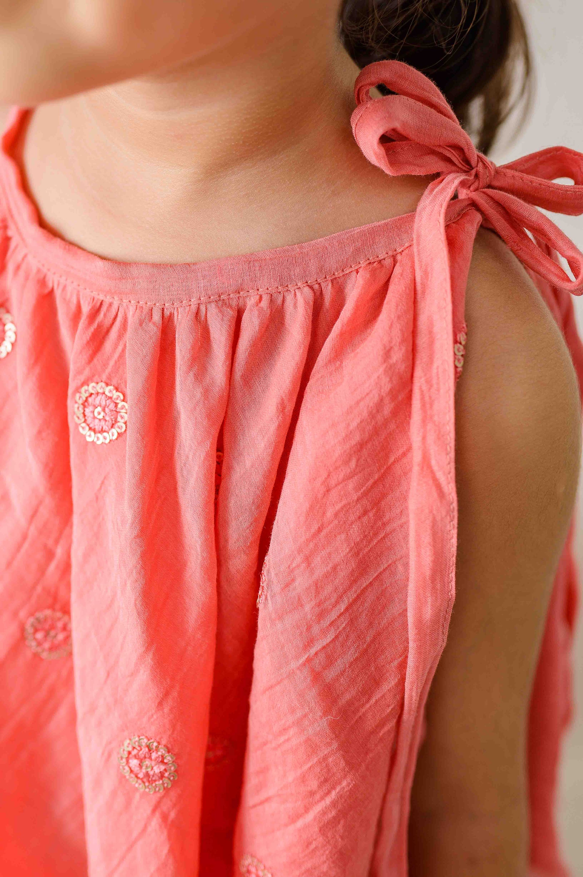 Soft, sweet, and full of festive flair—our Rosy Rasgulla Set is a gentle nod to the beloved mithai with a floral twist. Crafted in breathable mul chanderi, this outfit captures the charm of childhood with its dreamy rose-pink hue and delicate embroidered flowers on the top.