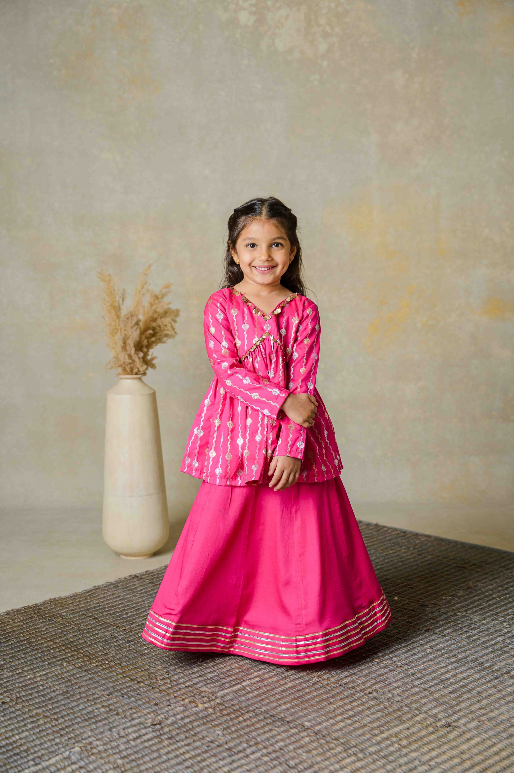 A dreamy blend of tradition and twirl—our Noor-e-Gulabi Lehenga Set brings together the timeless beauty of Banarasi weaves with the playful charm of childhood. Drenched in the prettiest shade of festive pink, this set is made for little girls who light up every celebration.