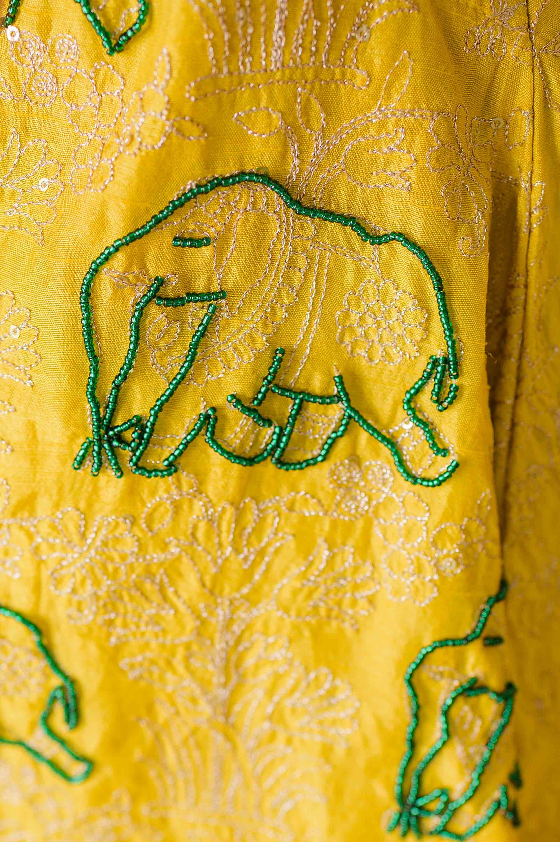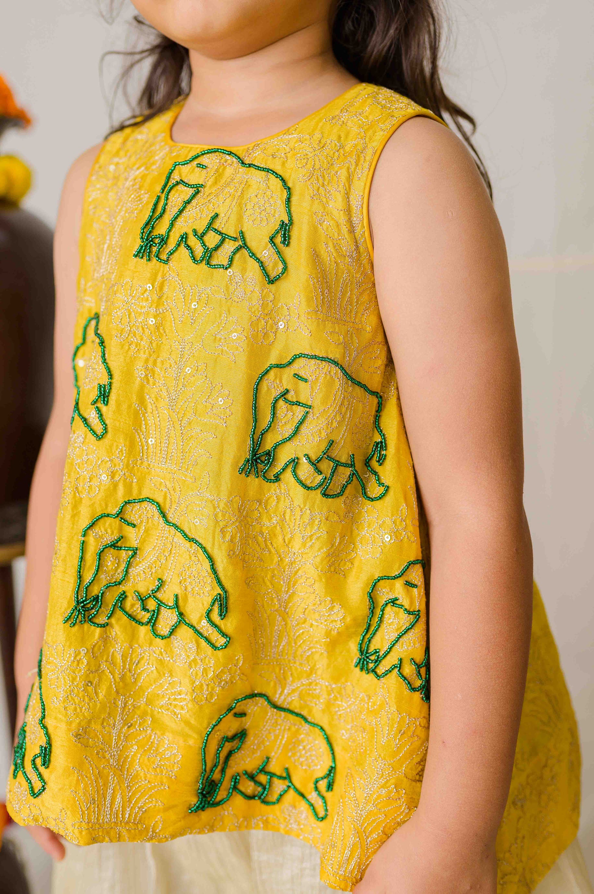 Bringing together festive sparkle and childhood charm, the Boondi Rani Set is inspired by the happy hues of yellow boondis. Crafted in rich embroidered silk for the top and soft tissue silk pants, it’s a sweet little celebration in every stitch. Hand-embroidered elephants add a royal, playful touch that kids will adore.