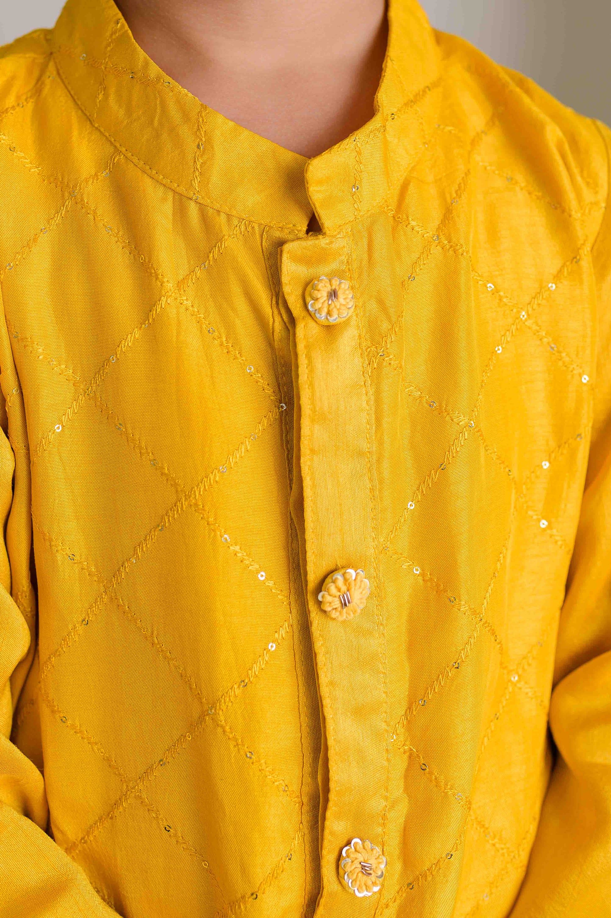 Inspired by the soft elegance of the beloved Bengali sweet, the Sondesh Kurta Set brings a delicate balance of tradition and festivity. Crafted in airy Chanderi fabric, this bright yellow kurta is adorned with hand-embroidered sequins and embroidered buttons, adding just the right touch of sparkle.